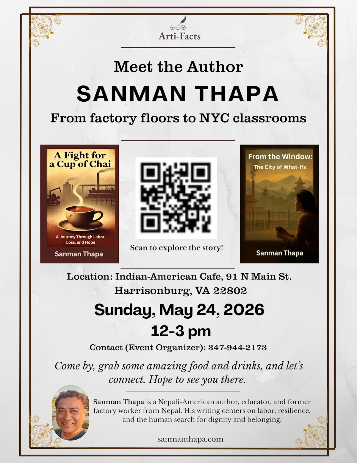 We’ll talk about my journey—from working in factories in Nepal to becoming a school counselor in New York—and the experiences that shaped my memoir, A Fight for a Cup of Chai, along with my first novella, which quietly mirrors that journey.